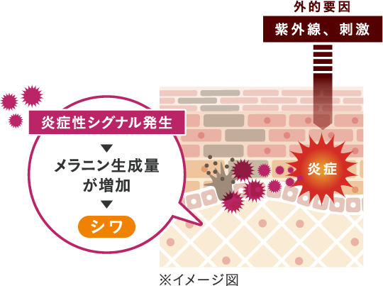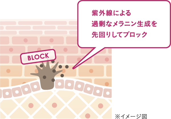 紫外線や刺激によるメラニンの生成をブロック。肌細胞がメラニンを取り込んでしまう前に、メラニンの伝達を抑制し、シミを予防します。