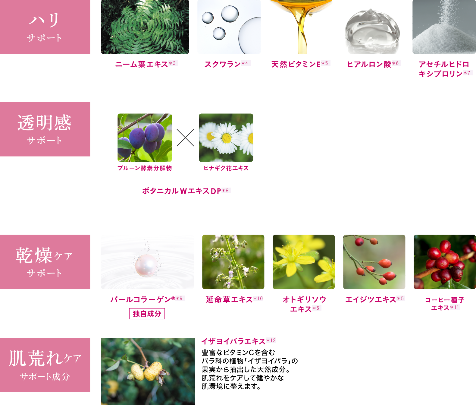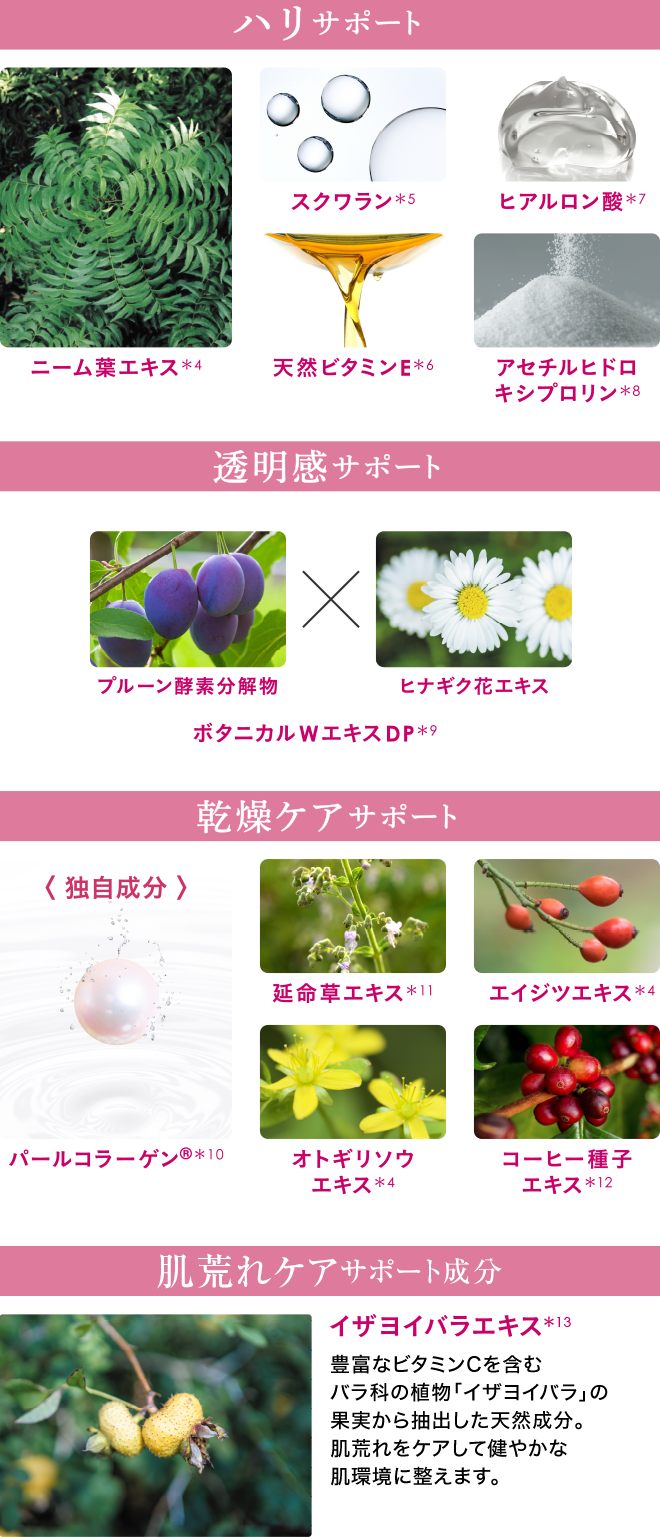 *2:サクシニルアテロコラーゲン液(保湿成分) *3:植物性スクワラン、オリーブ油、ホホバ油、マカデミアナッツ油、ローズヒップ油(保湿成分)